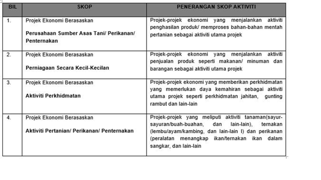 Program ini menyediakan bantuan kewangan dan pengurusan untuk membolehkan kumpulan sasar menyertai atau menjalankan projek-projek ekonomi dalam pelbagai sektor. Matlamatnya ialah untuk meningkatkan pendapatan keluarga serta meningkatkan taraf hidup dan seterusnya mengeluarkan mereka daripada belenggu kemiskinan. Bantuan diberikan dalam pelbagai bentuk termasuk Aset/ premis/ bengkel/ ruang niaga/ mesin/ peralatan bantuan/ bahan mentah, latihan/kursus kemahiran asas, bimbingan serta kos khidmat pengurusan yang disampaikan melalui Agensi Pelaksana